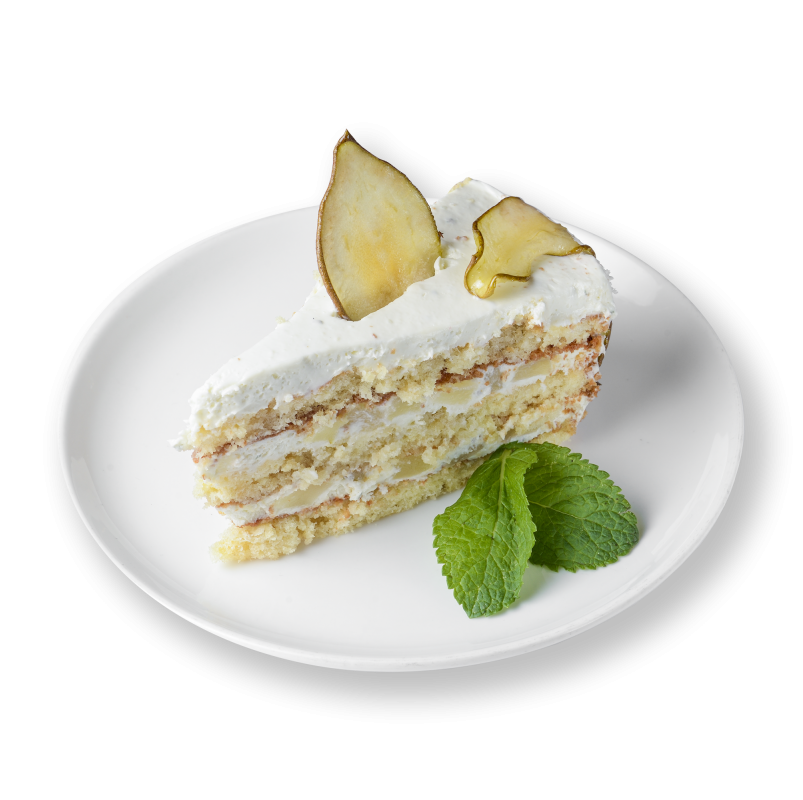 БІЛИЙ БІСКВІТ, ПРОСОЧЕНИЙ ГРУШЕВИМ СИРОПОМ, ВЕРШКОВО-СИРНИЙ КРЕМ (СИР ДОРБЛЮ, СИР МАСКАРПОНЕ, СИР ФІЛАДЕЛЬФІЯ, ВЕРШКИ), КАРАМЕЛІЗОВАНА ГРУША.