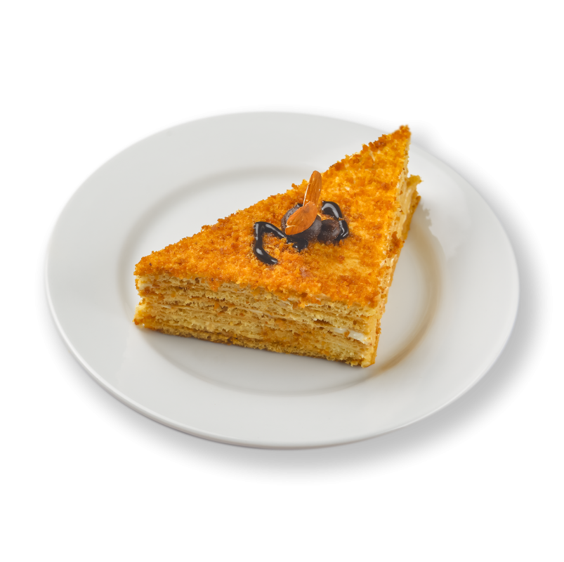 МЕДОВІ КОРЖІ ЗІ СМЕТАННИМ КРЕМОМ, ПРИКРАШЕНІ КРИХТОЮ ТА ШОКОЛАДНИМ ТОПІНГОМ