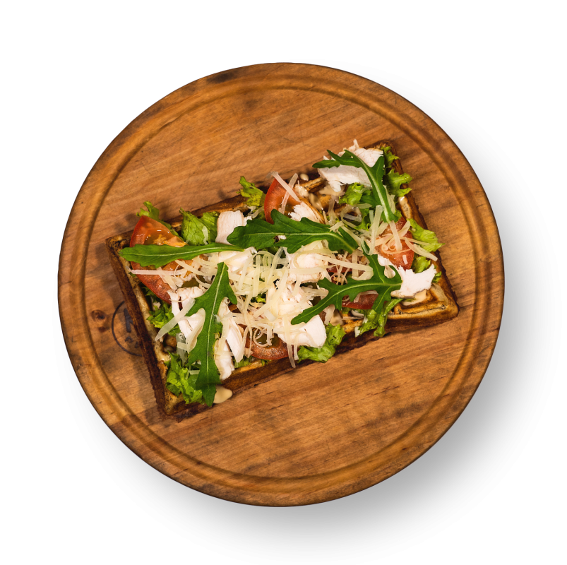 Вафлі, лист салату, соус цезар, курка гриль, помідор, сир пармезан, рукола