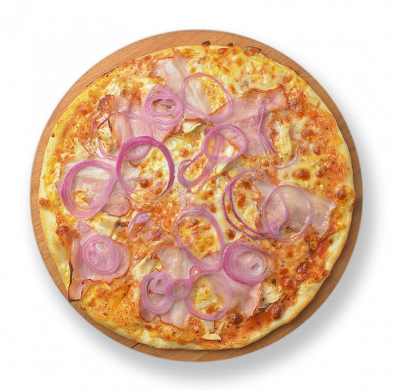 КУРИЦА, ВЕТЧИНА, БЕКОН, ЛУК МАРИНОВАНЫЙ, СЫР, СОУС
