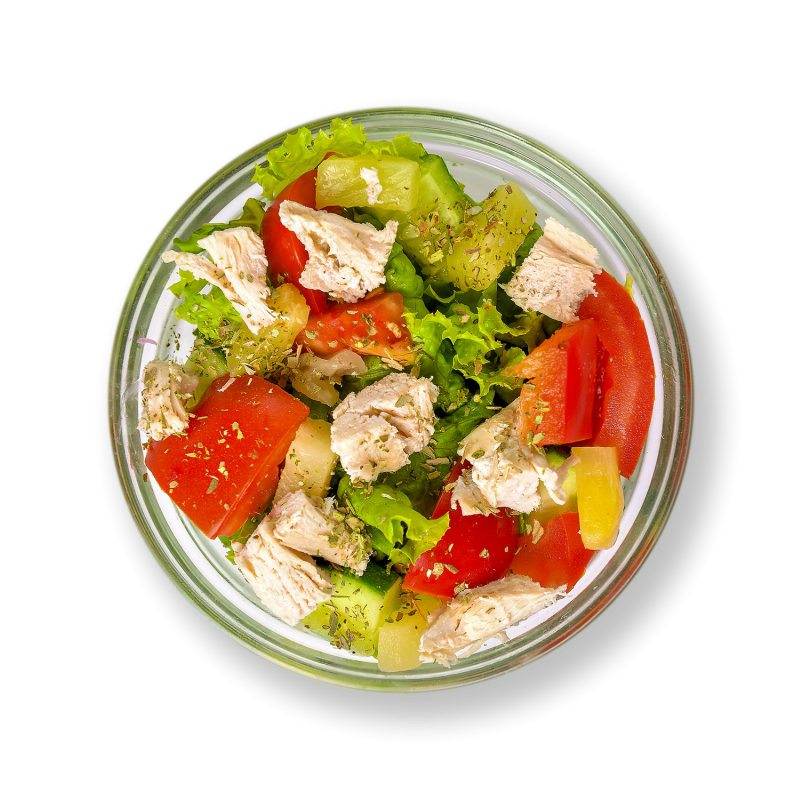 КУРЯЧЕ ФІЛЕ, ПЕРЕЦЬ БОЛГАРСЬКИЙ, ПОМІДОР, ОГІРОК СВІЖИЙ, ЛИСТ САЛАТУ, АНАНАС КОНСЕРВОВАНИЙ, ЛИМОННИЙ СІК, СОНЯШНИКОВА ОЛІЯ