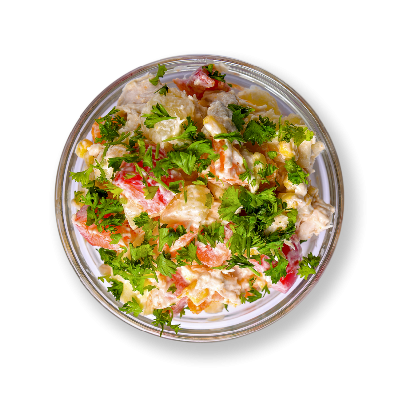 КУРЯЧЕ ФІЛЕ, КАРТОПЛЯ, МОРКВА, ЯБЛУКО, ПЕРЕЦЬ БОЛГАРСЬКИЙ, КУКУРУДЗА, ЦИБУЛЯ РІПЧАСТА, МАЙОНЕЗ