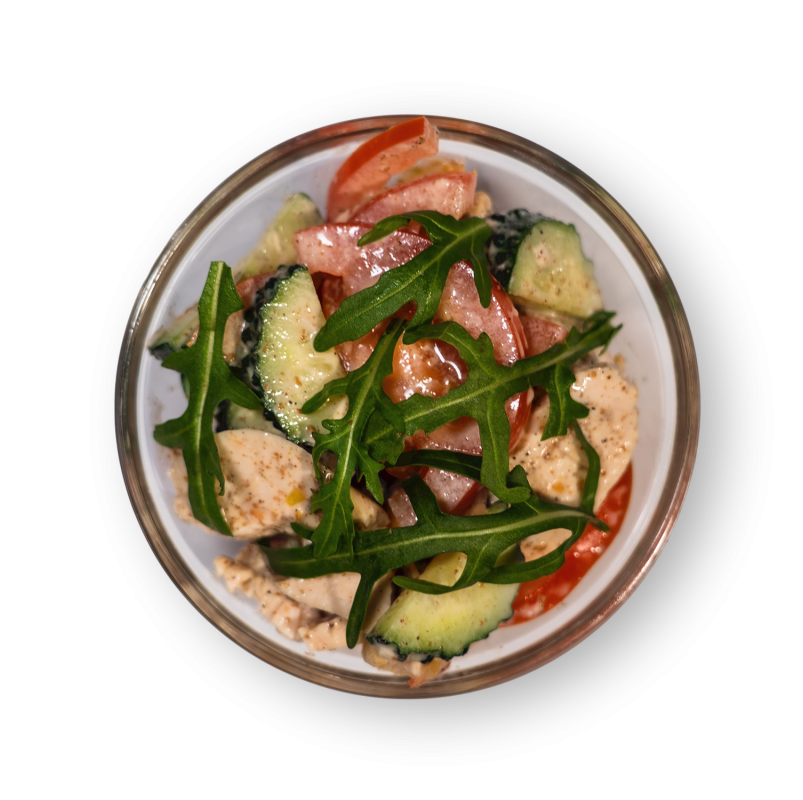 Помідор, огірок свіжий, курка гриль, горіховий соус, рукола